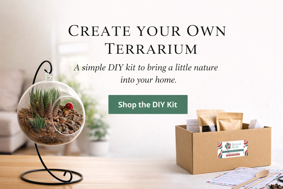 I got a terrarium for my desk and it is nice to look at my healthy succulents every day. Always Alive have provided an outstanding after purchase support to help me care for the plants. Edith